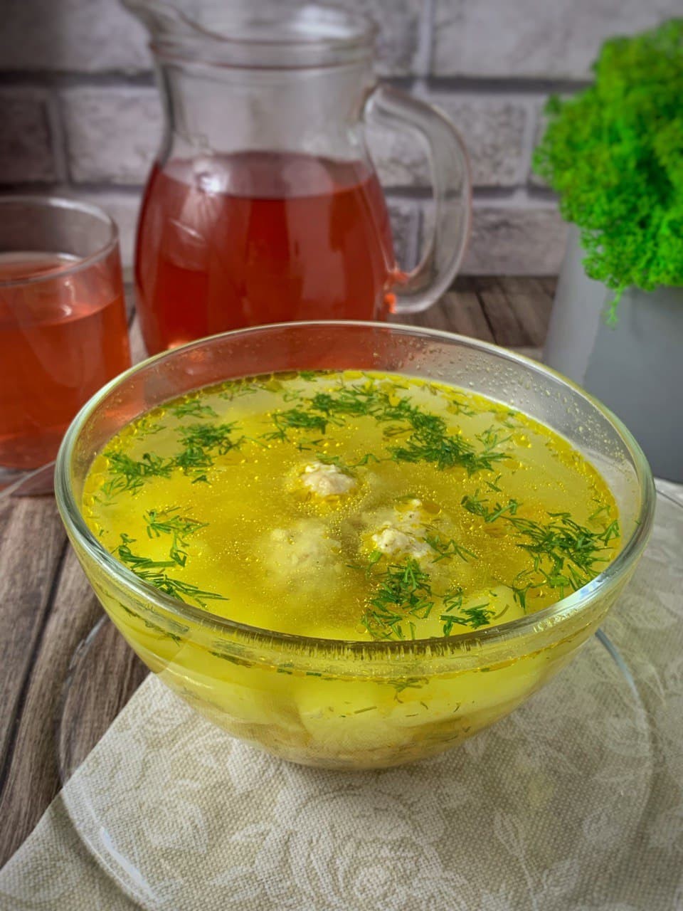 Склад: м'ясний бульйон, вермішель, картопля, цибуля, морква, зелень фрикадельки.